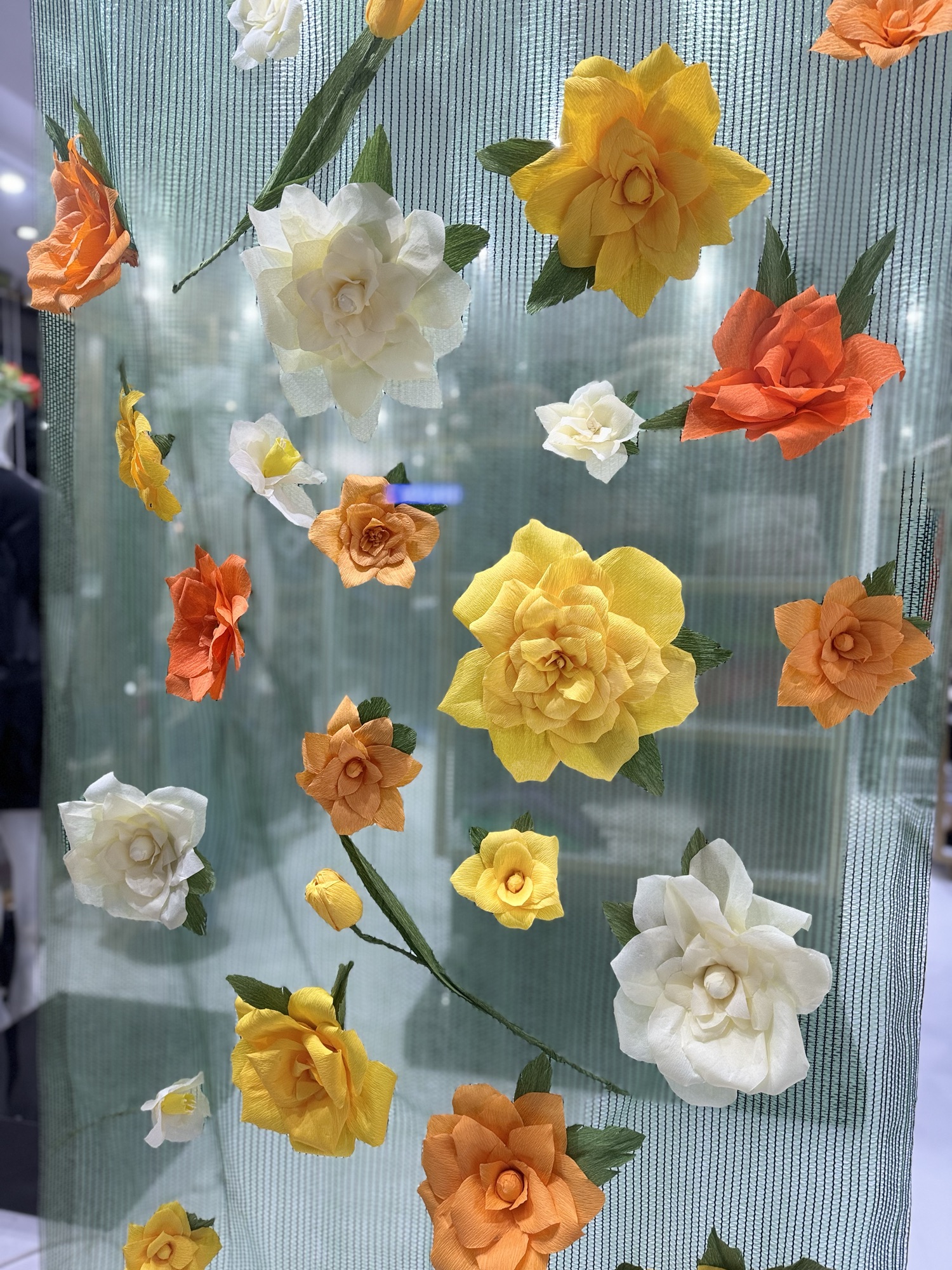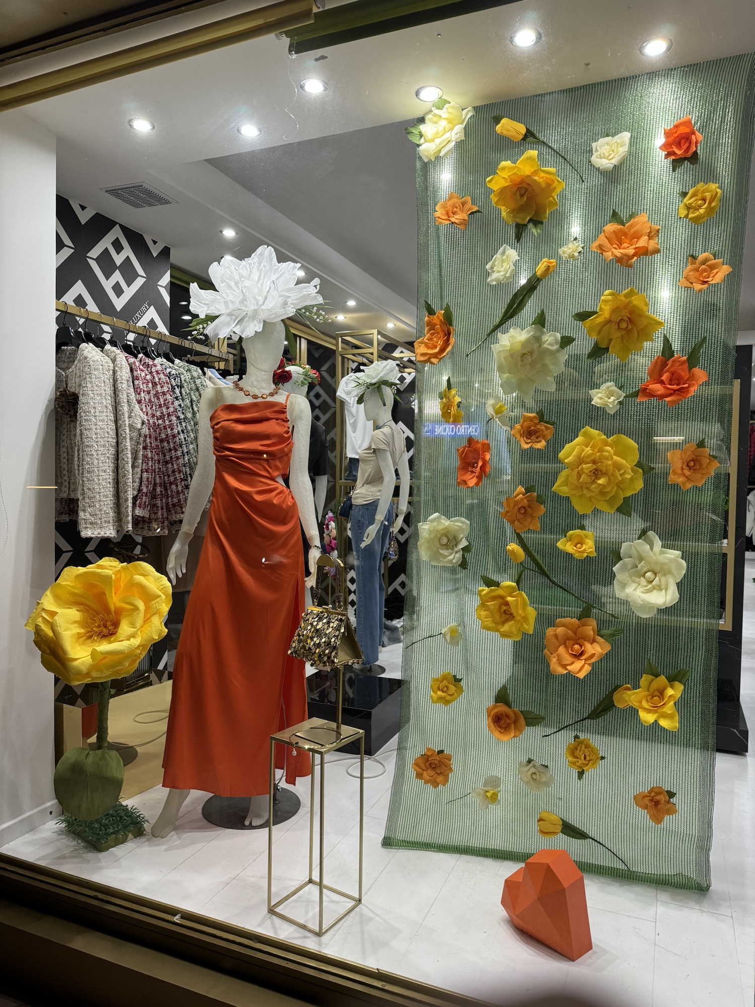 Le vetrine di AML (A M Luxury), ideate da Maria e realizzate da Irene, sono un vero e proprio spettacolo visivo. Ogni vetrina è un’opera unica, ispirata alla bellezza e alla varietà dei fiori. Ciò che le rende straordinarie è che questi fiori non sono reali, ma sono fatti a mano con carta crespa da Irene Argentieri. Con la sua maestria nell’uso dei colori e dei materiali, trasforma la carta pesta in vere e proprie sculture floreali, creando composizioni che sembrano sfidare la legge di gravità.