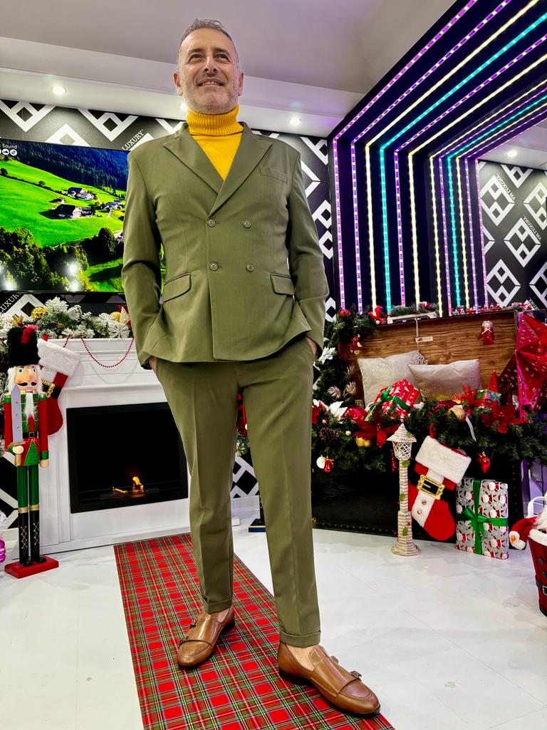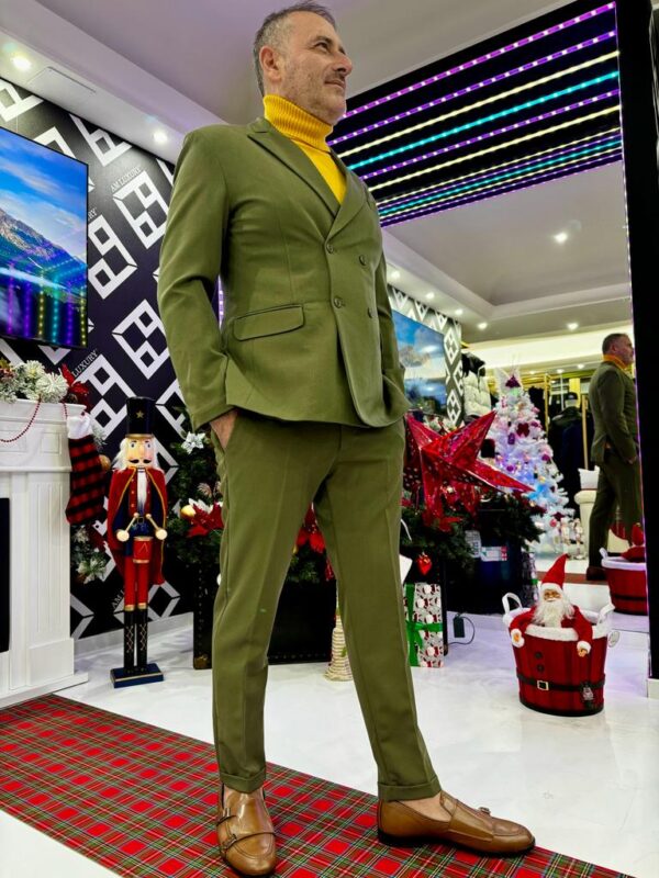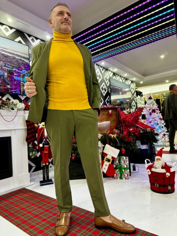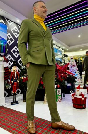 Questo abito da uomo verde, dal taglio doppio petto, incarna l’eleganza senza tempo. Realizzato in tessuto di alta qualità, il colore verde conferisce un tocco distintivo. Il design doppio petto aggiunge sofisticazione, mentre la vestibilità attenta alla silhouette offre un aspetto raffinato e moderno. Con dettagli curati come bottoni dorati, questo abito è l’emblema di stile e classe.