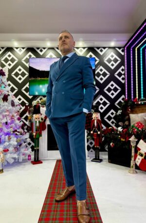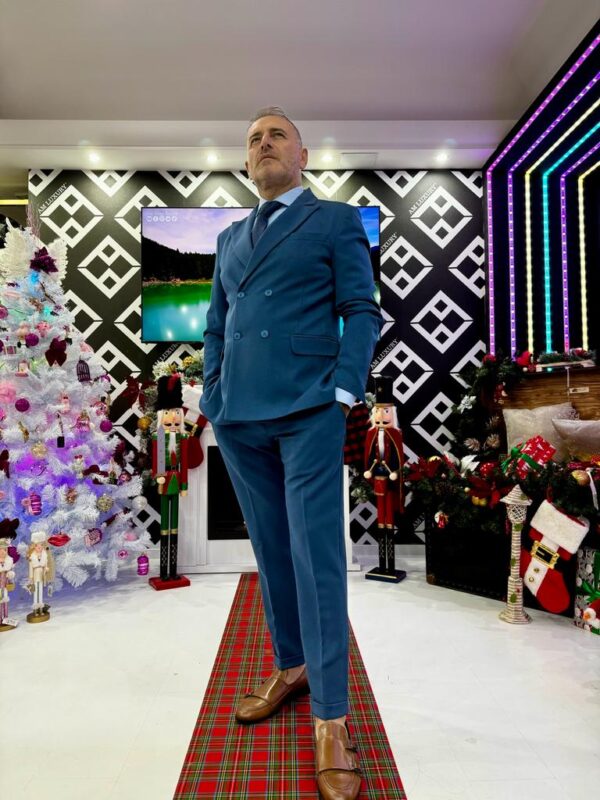 Il design potrebbe includere dettagli come revers definiti, bottoni di qualità e una vestibilità aderente che sottolinea la figura maschile. Il blu navy, nella sua tonalità profonda, aggiunge un elemento di serietà e versatilità, rendendo questo vestito adatto sia per occasioni formali che per eventi meno formali.