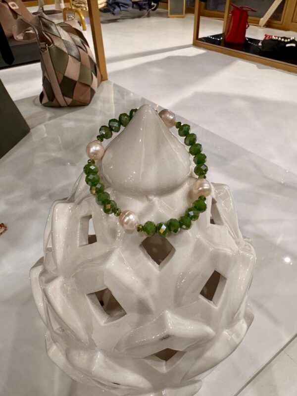 Il bracciale presenta una fusione armoniosa di elementi distinti, con pietre verdi che aggiungono una nota di freschezza e vitalità. Gli inserti in acciaio conferiscono un tocco contemporaneo e robusto, mentre le perle apportano un elemento di grazia e raffinatezza. Questo accessorio è una dichiarazione di stile che bilancia con maestria elementi naturali e industriali, creando un look unico e versatile per chi cerca un tocco di originalità nella propria eleganza.