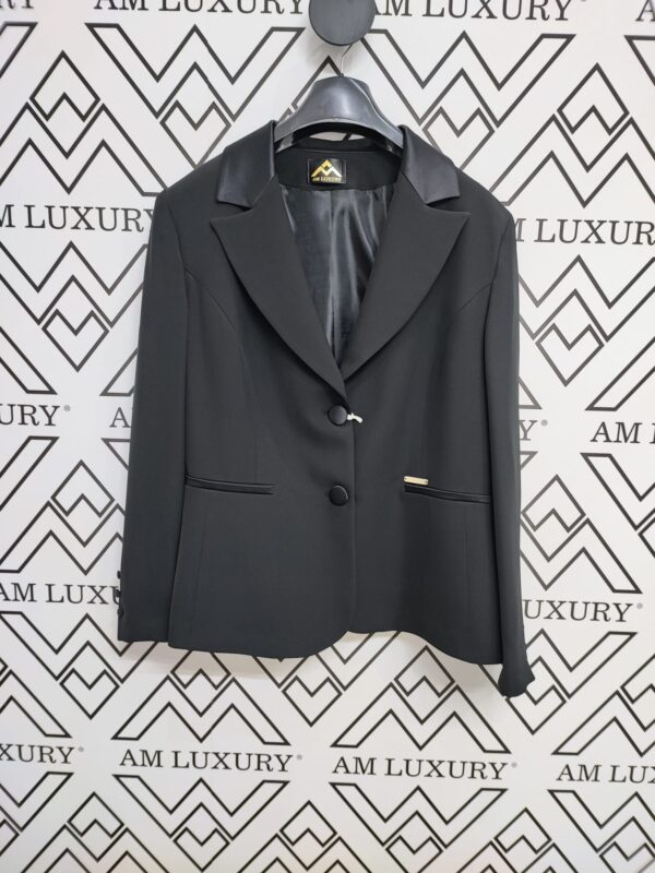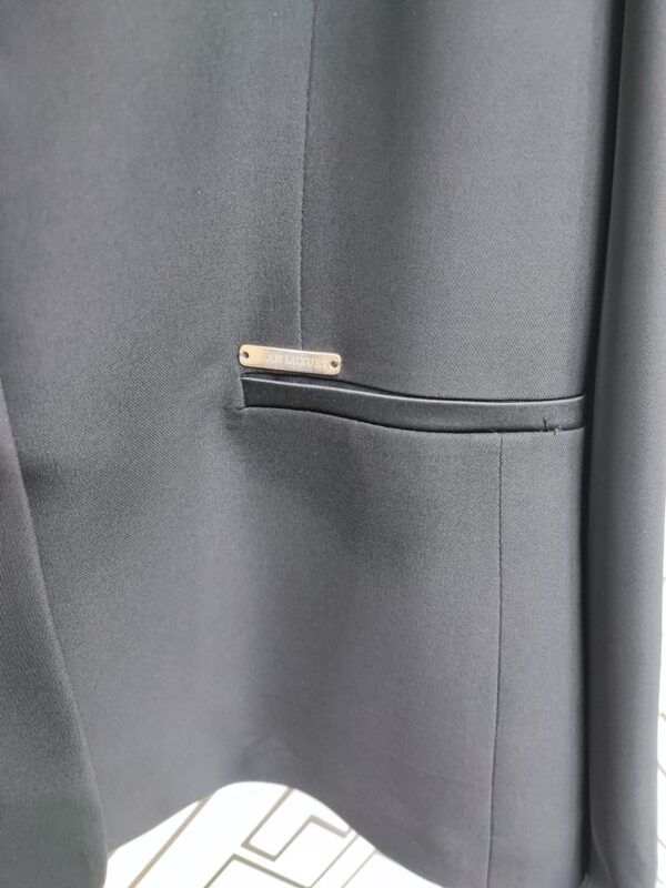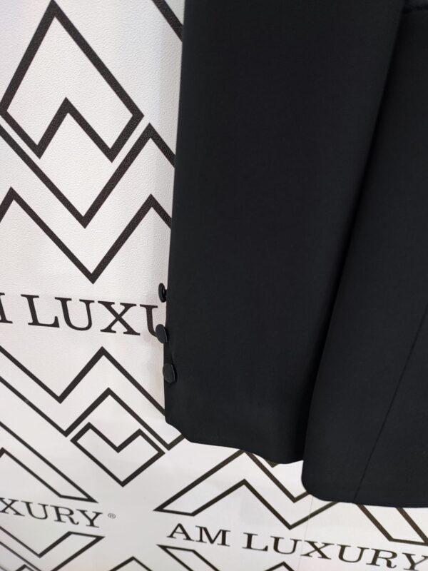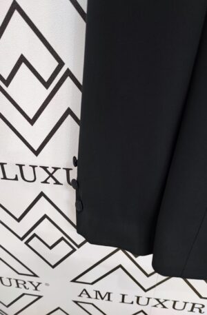 La giacca si veste di un sofisticato nero, conferendo un’aura di versatilità e classe. I bottoni centrali e le rifiniture delle tasche in raso tono su tono aggiungono dettagli raffinati, creando un capo di abbigliamento senza tempo. Questa elegante giacca nera è la scelta perfetta per un look raffinato e versatile, adatta a molteplici occasioni.