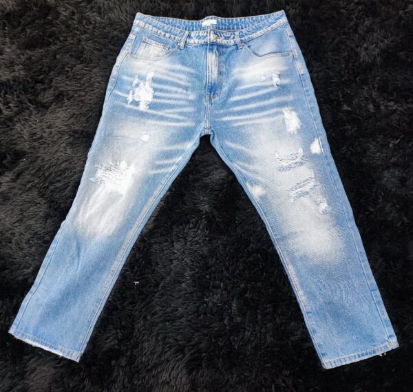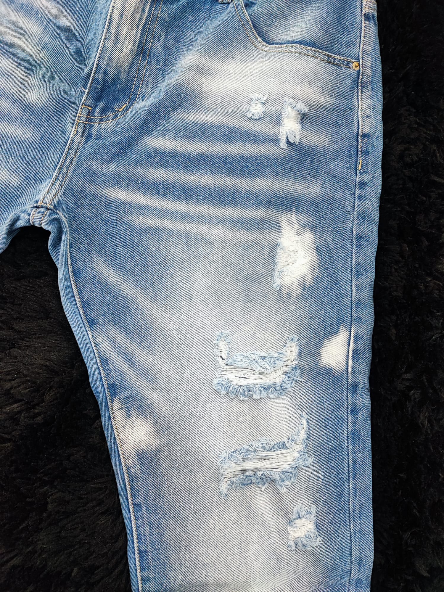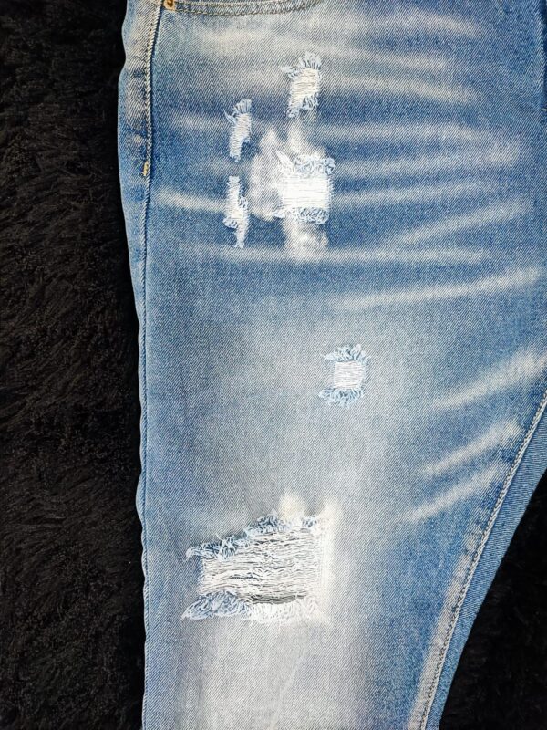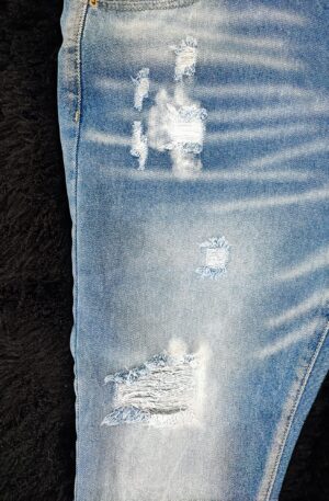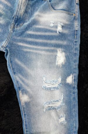Questi jeans strappati sono l’espressione di uno stile ribelle e alla moda. Caratterizzati da strappi strategici lungo le gambe, aggiungono un tocco di grinta al tuo look. Realizzati con denim resistente, mantengono un aspetto fresco e casual. Perfetti per chi cerca un look trendy e informale, questi jeans strappati sono un’opzione audace che trasmette un’aura di giovinezza e individualità.”