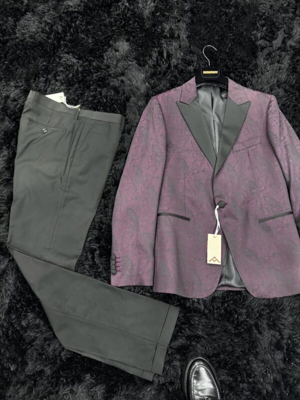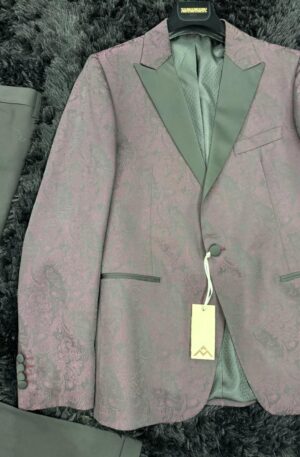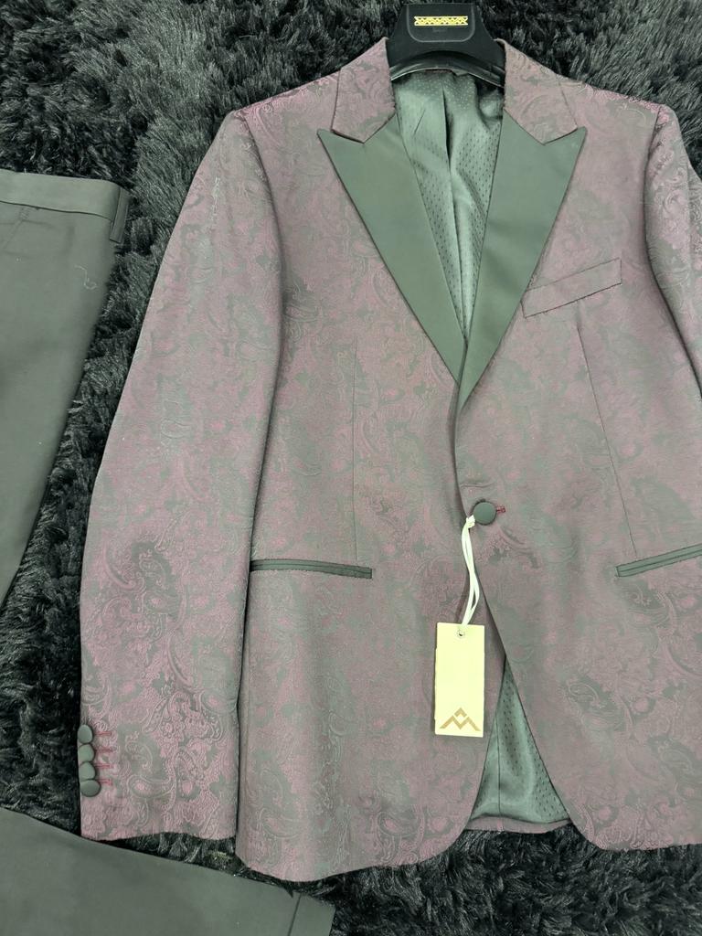 L’abito presenta una giacca damascata color bordeaux che aggiunge un tocco di ricercatezza grazie al suo motivo raffinato. Le patte nere accentuano l’eleganza, creando un contrasto audace. Il pantalone nero completa il look con sobrietà e stile. Questo ensemble esprime un’eleganza senza tempo, perfetto per occasioni speciali o serate di classe. Con la giusta combinazione di dettagli distintivi e design sofisticato, questo abito cattura l’attenzione con il suo equilibrio tra classicità e modernità.