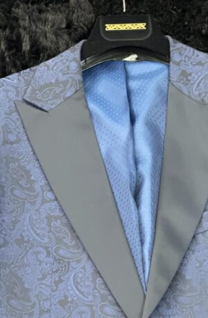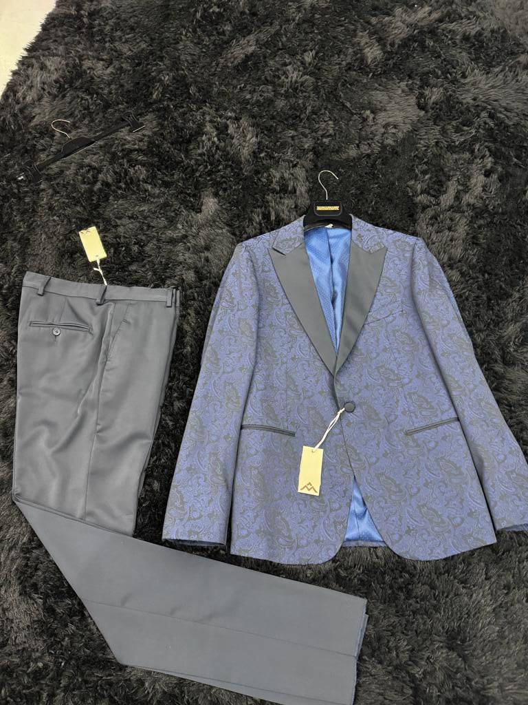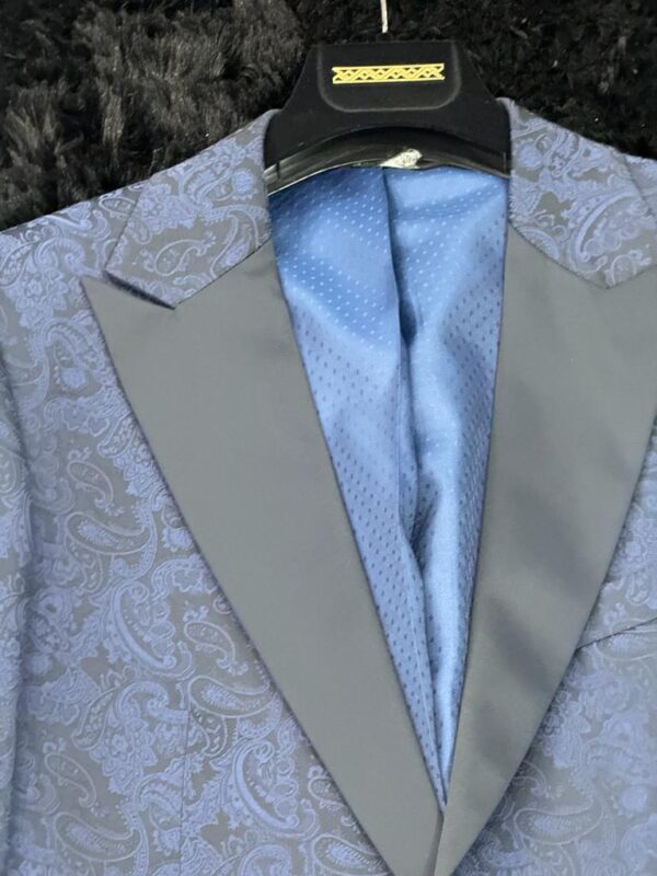 L’abito presenta una giacca damascata color blu che aggiunge un tocco di ricercatezza grazie al suo motivo raffinato. Le patte nere accentuano l’eleganza, creando un contrasto audace. Il pantalone blu completa il look con sobrietà e stile. Questo ensemble esprime un’eleganza senza tempo, perfetto per occasioni speciali o serate di classe. Con la giusta combinazione di dettagli distintivi e design sofisticato, questo abito cattura l’attenzione con il suo equilibrio tra classicità e modernità.